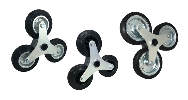 Zdjęcia prezentują koła wykorzystywane do wózków transportowych schodowych.