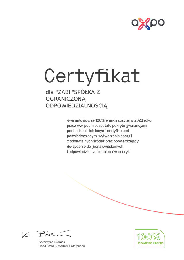 W ostatnim czasie nasza firma realizowała przedsięwzięcia dotyczące zużywania energii. Jesteśmy firmą, która stawia na rozwój i innowację dlatego chcielibyśmy się z Państwem podzielić bardzo dobrą informacją. Otrzymaliśmy certyfikat gwarantujący że 100% naszej zużywanej przez nas energii jest wytworzane z odnawialnych źródeł. Dzięki czemu dołączyliśmy do grona świadomych i odpowiedzialnych odbiorców energii.