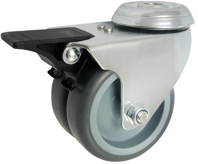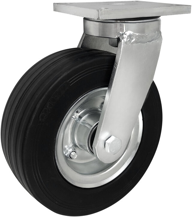 Dla modeli o cięższej wadze i większych gabarytach firma ZABI produkuje zestawy kołowe składające się z koła metalowo-gumowego w obudowie skrętnej. Koło metalowo- gumowe składa się z wysokiej jakości opony gumowej oraz metalowej felgi. Felga do koła wykonana jest poprzez proces tłoczenia blachy na prasach hydraulicznych. Następnie felga jest zabezpieczona poprzez cynkowanie galwaniczne. Koła te możemy zaobserwować w zamiatarkach pracujących przy utrzymaniu czystości na budowanych drogach.
