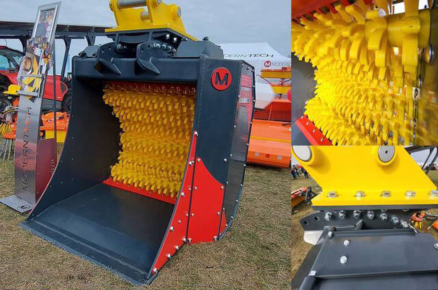 Łyżki przesiawająco-rozdrabniające to wszechstronne narzędzia zawierające elementy poliuretanowe w kształcie gwiazd, które łączą funkcje przesiewania i rozdrabniania materiałów.