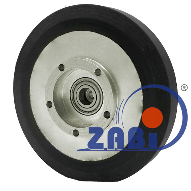 Na specjalne zlecenie firma ZABI wykonała koła do robotów magazynowych aluminiowo-poliuretanowe o średnicy 130 mm. Na życzenie klienta w kole wykonano precyzyjny korpus aluminiowy 6082 oraz bieżnik poliuretanowy w kolorze szarym o twardości 92 Shore A. Do kół zostały wykorzystane łożyska SKF 6001ZZ.