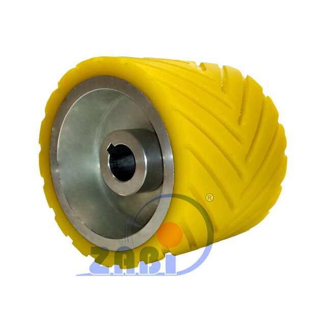 Na specjalne zlecenie firma ZABI wykonała koło napędowe metalowoo-poliuretanowe o średnicy 160 mm wykorzystane do szlifierki taśmowej. Na życzenie klienta w kole wykonano odpowiedni do wymagań rowek pod wpust oraz frezowany skośny bieżnik poliuretanowy o twardości 92 Shore A. Więcej o właściwościach poliuretanu w osobnym artykule. Szerokość koła wynosiła 130 mm, otwór w piaście=28 mm.