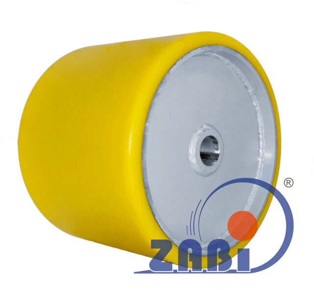 Na specjalne zlecenie firma ZABI wykonała koło obrotnic metalowoo-poliuretanowe o średnicy 400 mm. Na życzenie klienta w kole wykonano odpowiedni do wymagań rowek pod wpust oraz bieżnik poliuretanowy o twardości 92 Shore A. Więcej o właściwościach poliuretanu w osobnym artykule. Szerokość koła wynosiła 300 mm, otwór w piaście=50 mm.