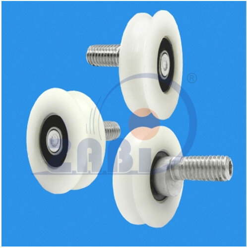 Rolka poliamidowa z trzpieniem gwintowanym i mimośrodem jest używana do płynnej regulacji naciagu oraz docisku odpowiednich elementów. Przedstawiony przykład pochodzi z konstrukcji wind do przewozu osób lub towarów.
