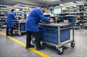 W strefach EPA, czyli obszarach chronionych przed wyładowaniami elektrostatycznymi, wszystkie elementy wyposażenia powinny współpracować z systemem ochrony ESD. Dotyczy to także wózków, regałów, stołów mobilnych oraz pojemników na kołach.