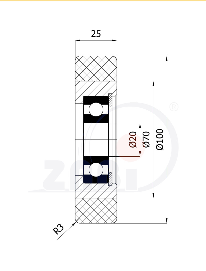 Rolki tworzywowe i metalowe, Rolki metalowo-poliuretanowe, Twardość 93 Sh'A o symbolu RMP-100-25/20