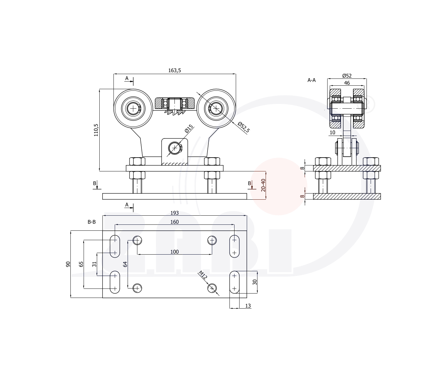 Wózki i akcesoria do bram, Wózki do bram przesuwnych, Do profili 60x60 ścianka 3mm o symbolu WR-5MM-60