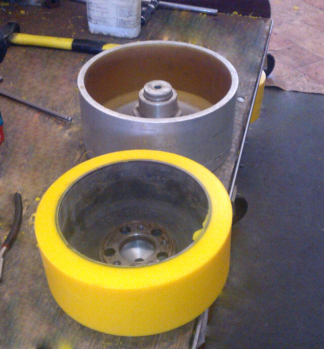 Etapy procesu oblewania i regeneracji poliuretanem kół i rolek, oraz detali z metalu, żeliwa i aluminium: